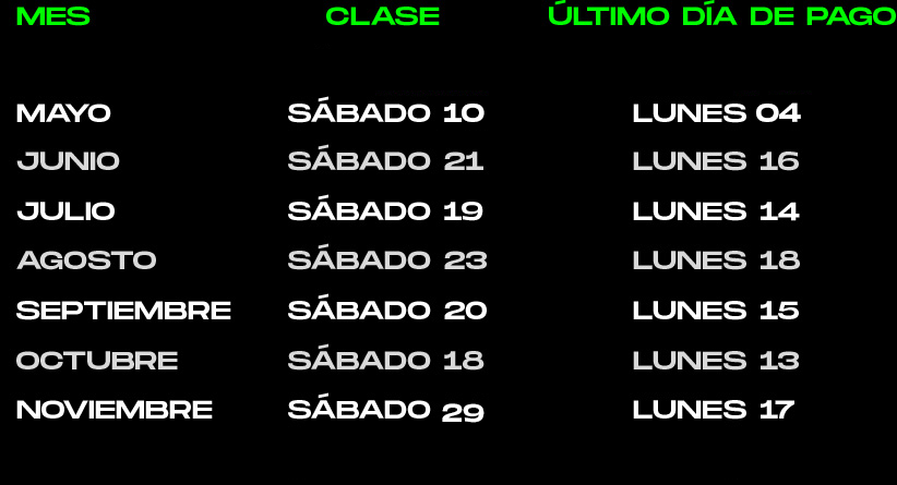 • Frecuencia: Puedes encontrar el calendario de clases a continuación. Las clases se llevarán a cabo los días sábados.
