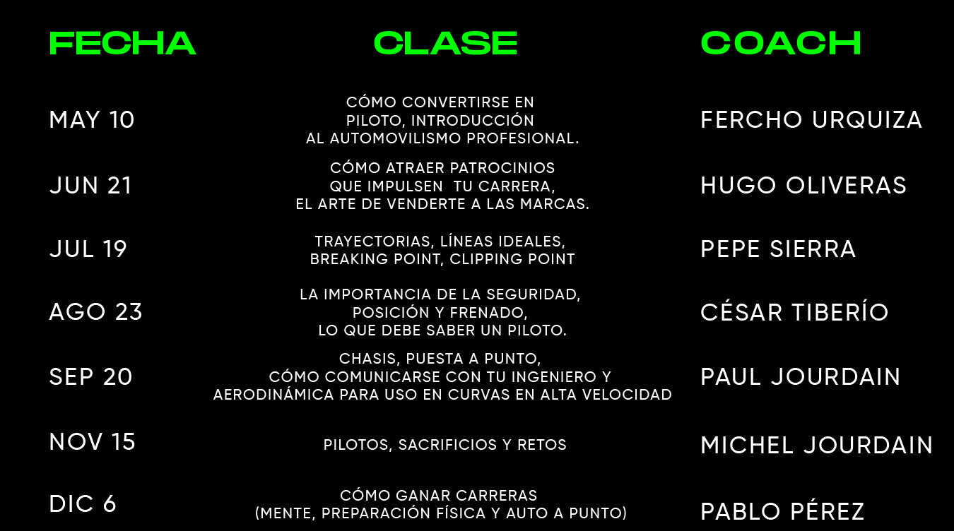 Si eres amante del automovilismo y quieres acceder a clases con pilotos profesionales ¡esta es tú oportunidad! El PDP consta de 9 clases online (en vivo) que podrás tomar desde cualquier parte del mundo, y si te inscribes antes del 14 de abril tú primera clase será gratis.